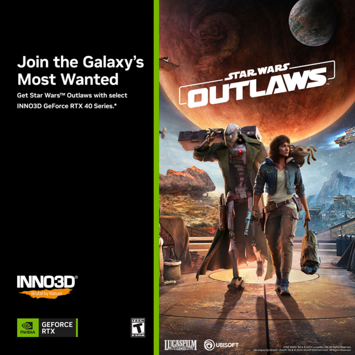 Od teraz przy zakupie karty graficznej INNO3D z serii GeForce RTX 40 można odebrać za darmo grę Star Wars Outlaws. Warunki promocji wcale nie są skomplikowane. Należy nabyć układ GeForce RTX 4080 SUPER, RTX 4080, RTX 4070 Ti SUPER, RTX 4070 Ti, RTX 4070 SUPER lub RTX 4070 od INNO3D do dnia 19 września bieżącego roku (akcja nie dotyczy modeli RTX 4060 Ti i RTX 4060). Następnie wystarczy już tylko oczekiwać na e-maila z kodem uprawniającym do odbioru gry, który trzeba zrealizować do 31 października.