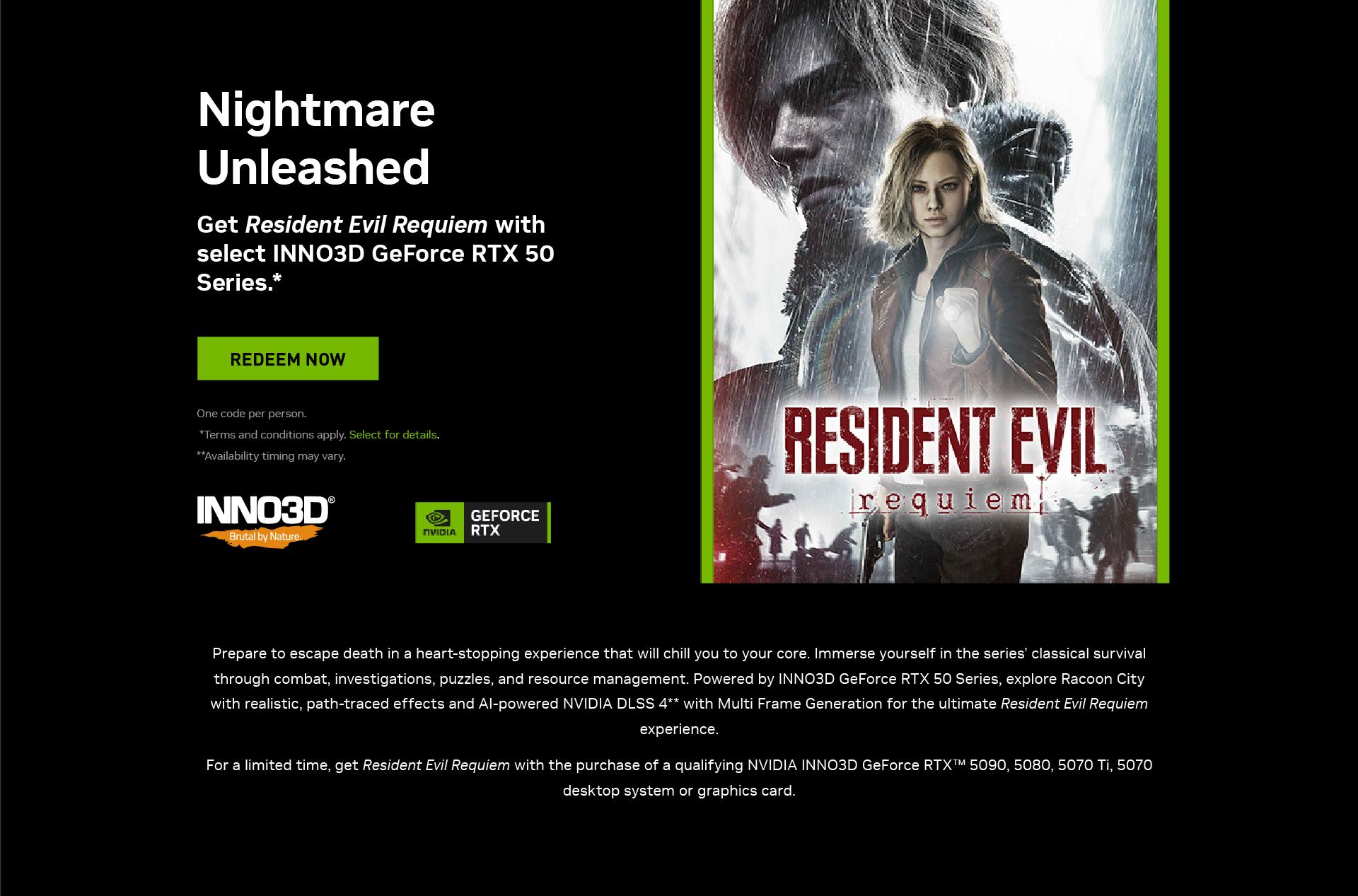 Marka INNO3D uruchomiła nową promocję, w ramach której do wybranych modeli GeForce RTX 50 dołączana jest gra Resident Evil Requiem w wersji cyfrowej – bez dodatkowych kosztów. Promocja obowiązuje przy zakupie od 10 lutego do 16 marca 2026 roku i dotyczy kart INNO3D GeForce RTX 5090, RTX 5080, RTX 5070 Ti oraz RTX 5070. Kod aktywacyjny gry można zrealizować najpóźniej do 16 kwietnia 2026 roku.