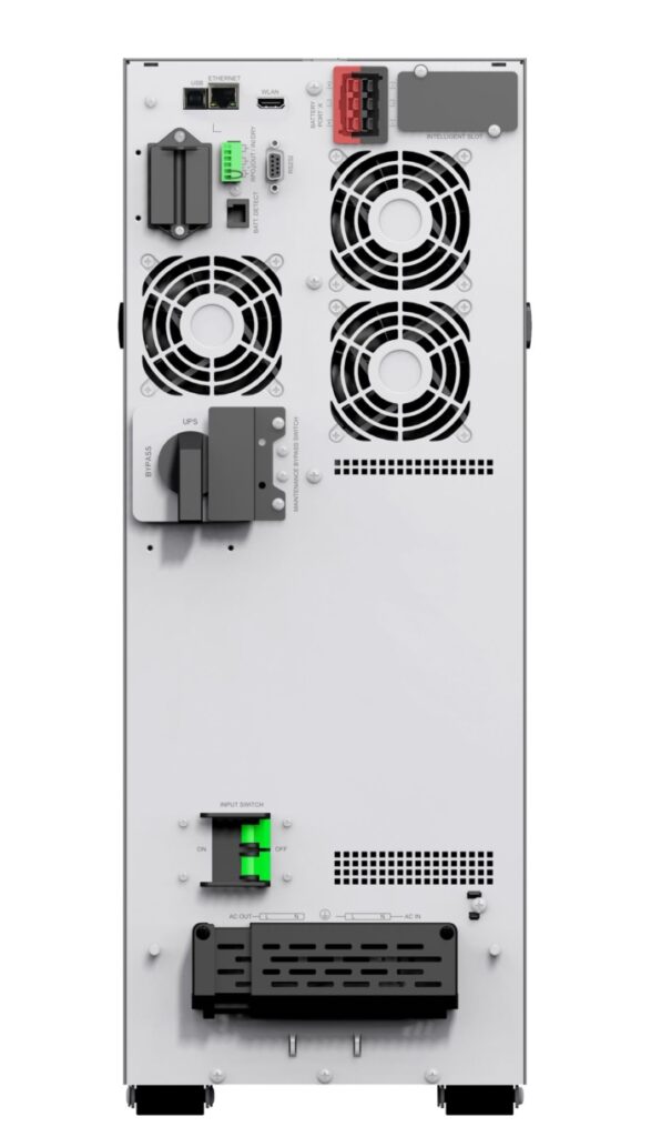 Połączenie zasilacza awaryjnego z Internetem realizowane jest poprzez złącze RJ-45, zlokalizowane z tyłu obudowy. Opcjonalnie producent przewiduje możliwość wyposażenia go w moduł WLAN, który pozwoli na nawiązanie połączenia bezprzewodowego. Ponadto został on wyposażony w port USB, RS 232, styki bezpotencjałowe, a także port EPO umożliwiający szybkie odcięcie urządzeń od zasilania.