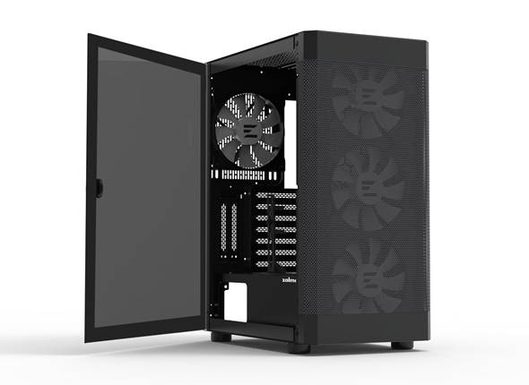 Zalman i4 TG to obudowa typu ATX Mid-Tower, która wyróżnia się wymiarami 396 x 255 x 484 mm i wagą 6,3 kg. Już na pierwszy rzut oka widać, że mamy do czynienia z modelem dla wymagających – wskazuje na to panel frontowy typu Full Mesh, pod którym ukryto aż trzy wentylatory RGB LED o średnicy 140 mm. Co więcej, z tyłu obudowy umieszczono dodatkowy rotor RGB LED 140 mm. Użytkownik może zatem liczyć na optymalny przepływ powietrza.