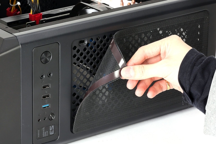 Dla osób oczekujących jeszcze lepszej cyrkulacji przewidziano możliwość instalacji dodatkowych pięciu wentylatorów i dwóch radiatorów 120 mm. Na wyróżnienie zasługują także dwa filtry przeciwkurzowe, które zadbają o odpowiednią ochronę podzespołów. W górnej części obudowy znajdziemy czytelny panel z przyciskiem zasilania, reset, złącze słuchawkowe i mikrofonowe, a także port USB 3.0 i dwa gniazda USB 2.0.