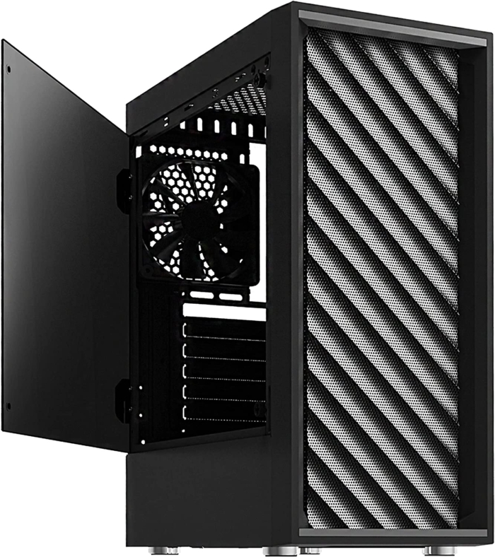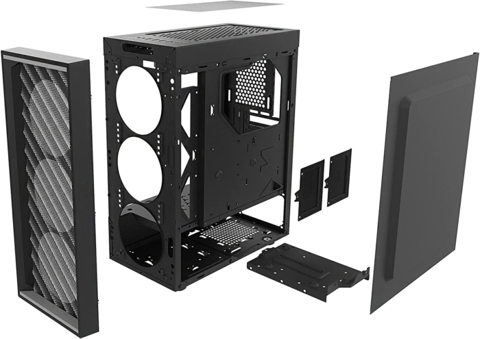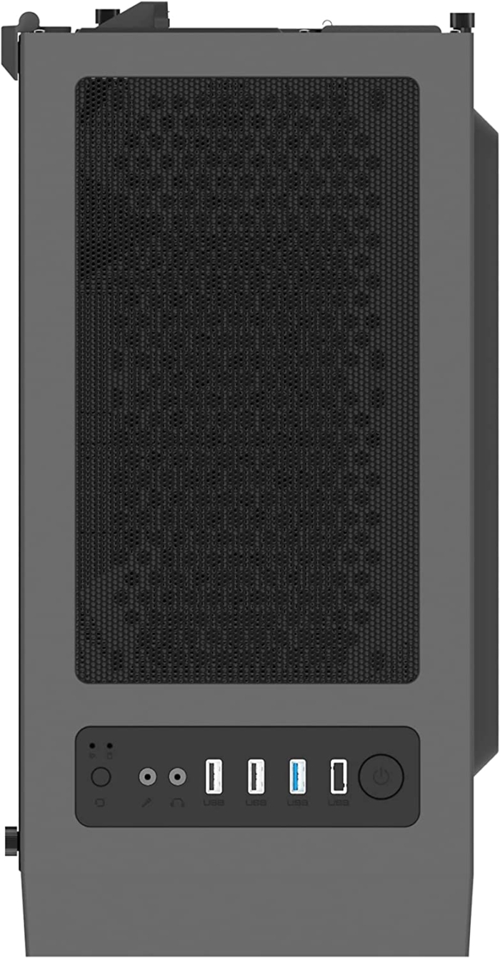 Wewnątrz pomieści się chłodzenie procesora o wysokości do 150 mm, karta graficzna o długości do 305 mm, zasilacz o długości do 150 mm, a także dwa dyski 3,5” i cztery nośniki 2,5”. W górnej części obudowy umieszczono funkcjonalny panel I/O zawierający trzy złącza USB (w tym jeden port w standardzie 3.0), gniazdo słuchawkowe, mikrofonowe oraz przyciski do włączania/wyłączania komputera i reset.